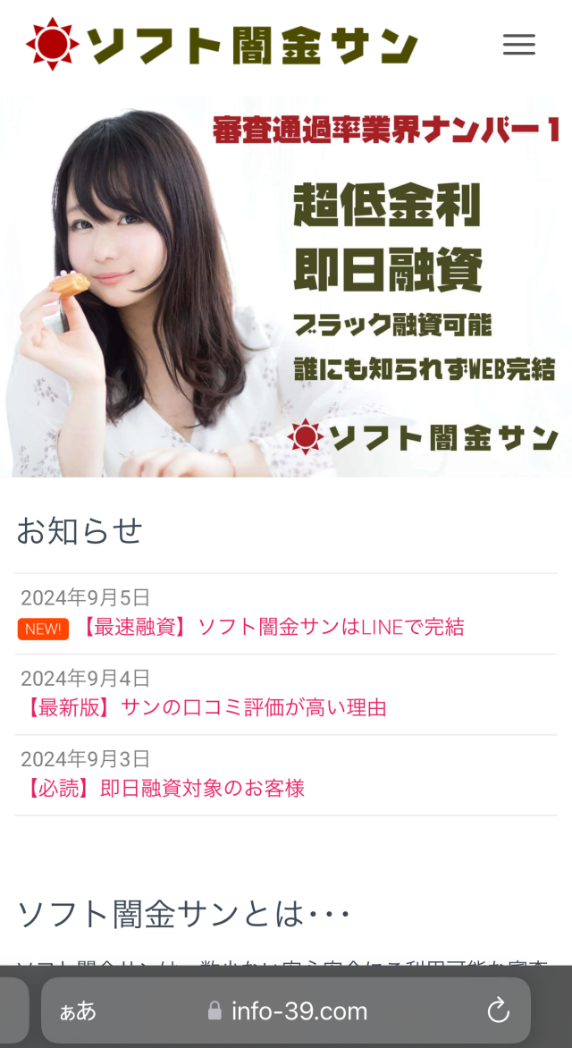 24時間お申し込み受付中最短30分スグにお借入れ。完済5回で条件アップ、最新のソフト闇金ですなどと大手消費者金融より簡単に貸してくれそうなことが書かれていますが、貸してくれるどころが、違法金利での高利貸しやスマホやキャッシュカード、銀行口座を搾取する詐欺の被害に巻き込まれるだけです。