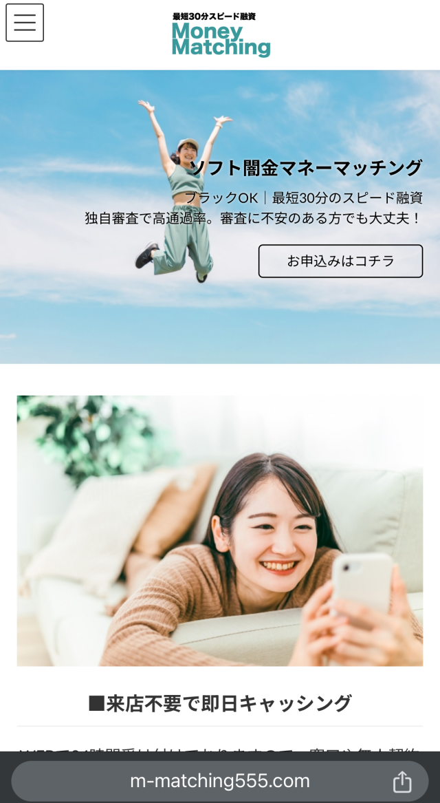 正規登録している貸金業サイトに見えますが、金融庁に未登録で融資業務を行えない違法サイトです。